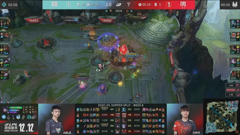 25分钟OMG带着大龙Buff推上高地,Able狂风闪现向前拿下双杀,OMG破掉FPX下路高地和门牙塔;