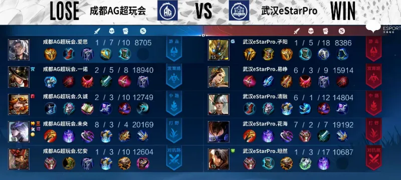 Game1:武汉eStarPro蓝色方,成都AG超玩会红色方