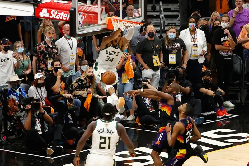 在比赛最后关头,霍勒迪完成致命抢断,随后字母哥完成终结比赛的扣篮。