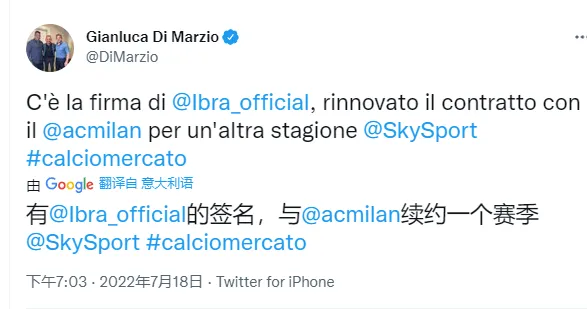 07月18日讯 根据意大利天空体育著名记者迪马济奥的最新报道,AC米兰的41岁老将伊布拉希莫维奇已经和球队正式签订续约合同。