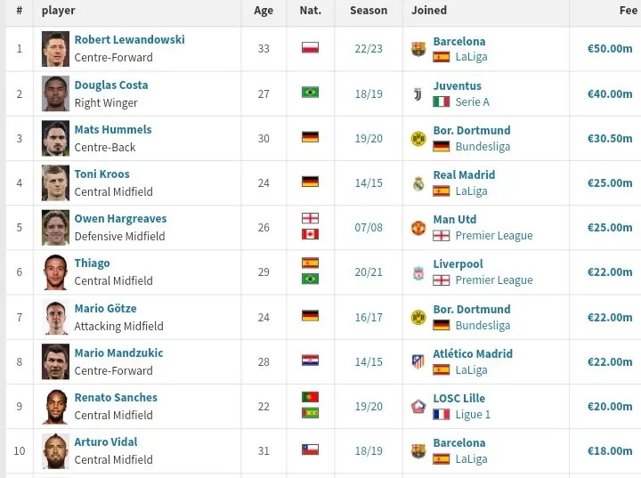 1.罗伯特-莱万多夫斯基:33岁转会,波兰,2022/23赛季转会,加盟巴塞罗那,转会费5000万欧