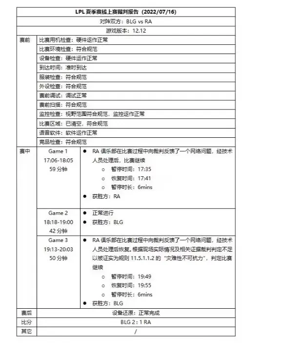 关于7月16日晚RA对战BLG时第一局及第三局中出现的网络波动状况的申诉具体情况如下: