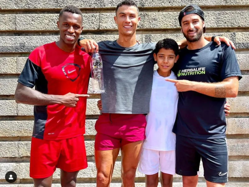 从照片上来看,C罗似乎刚完成训练。他身旁的两位好友是Jose Semedo和Miguel Paixao,这两位都是C罗在葡萄牙体育青训时的队友。