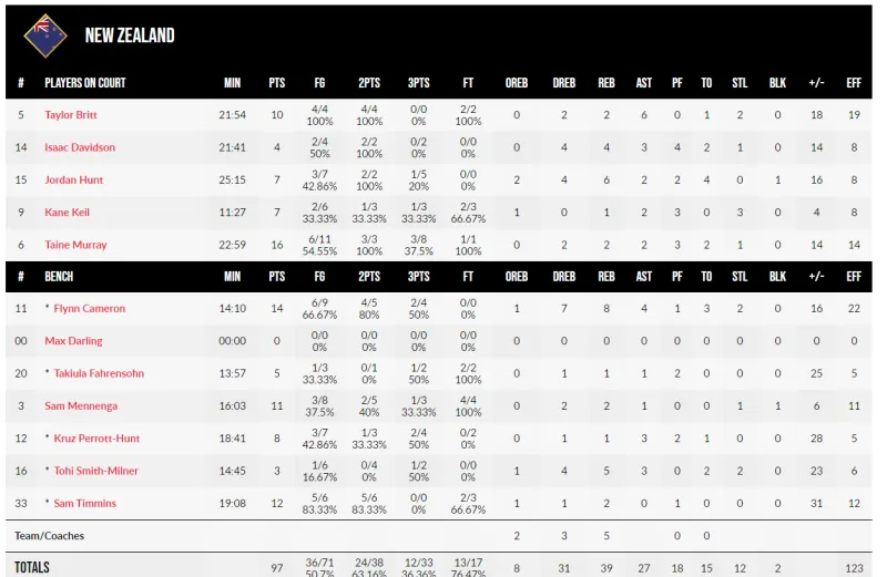 新西兰:卡梅隆14分8板4助2断、蒂明斯12分、K亨特8分3助、米尔纳3分5板3助2断、J亨特7分6板2助、穆雷16分、布里特10分6助2断、曼宁加11分。