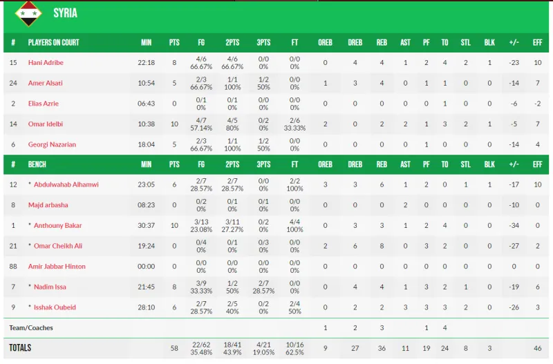 叙利亚:贝卡10分3板、艾萨8分4板、奥贝德6分3助2断、阿尔汉姆维6分6板、阿里8板、阿德里比8分4板、埃戴比10分。