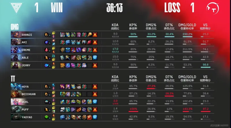 35分钟,OMG大龙逼团,随后TT正面团战溃败,OMG一波终结比赛。