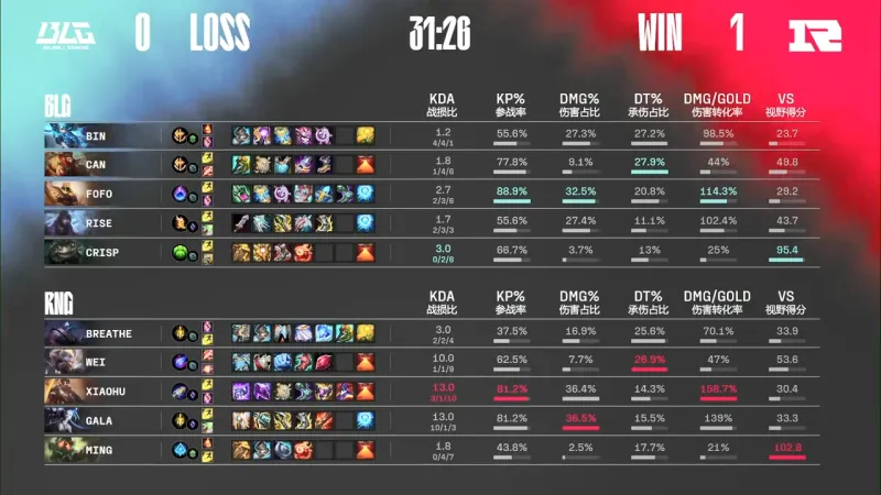 比赛前期双方着眼上路。Bin的格温被抓死两次落后Breathe贾克斯40刀。同时RNG前期控下前两条小龙。