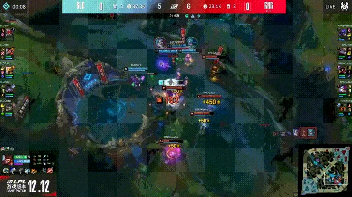 比赛第22分钟,双方上单在野区的摩擦迅速升级为两方团战。RNG打出1换3拿下电龙魂。