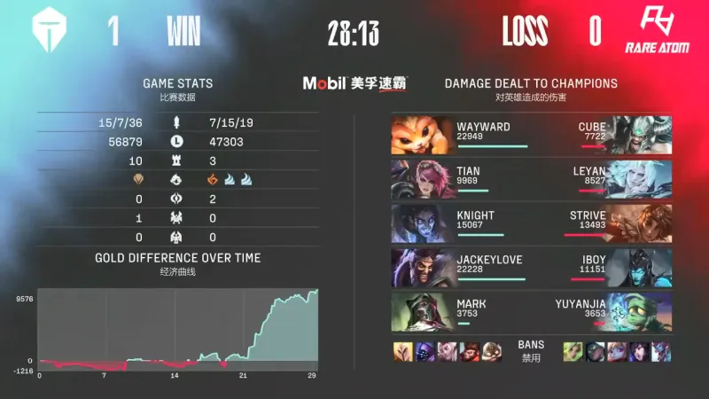 比赛第27分钟,Leyan佛耶戈被wayward纳尔不断追击配合德莱文击杀,knight也单杀岩雀随后TES直接一波结束比赛。