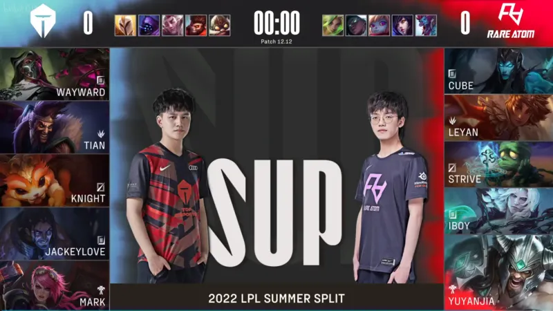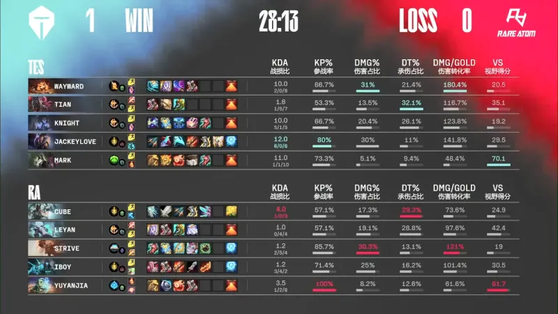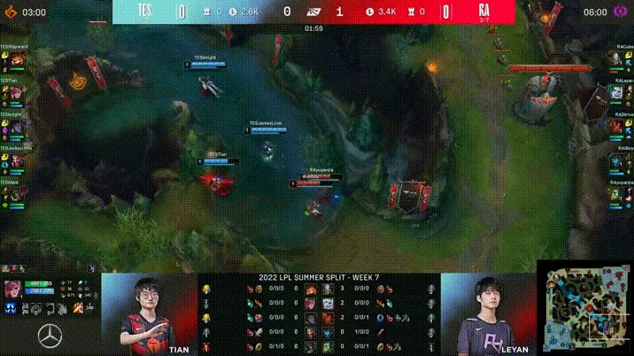 比赛第21分钟,双方在野区爆发团战,knight塞拉斯偷阿木木大招定到三人,RA正面完全无法接团迅速溃败。TES打出1换4并拿下大龙。