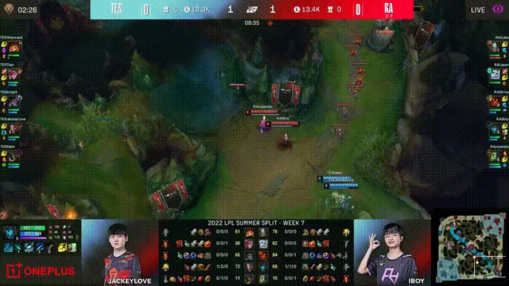 比赛第18分钟,RA在野区连续抓到TES中野将其击杀,但随后TES众人支援到位,在JackeyLove德莱文的带领下TES四包二击杀RA中野