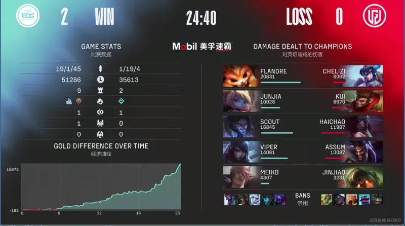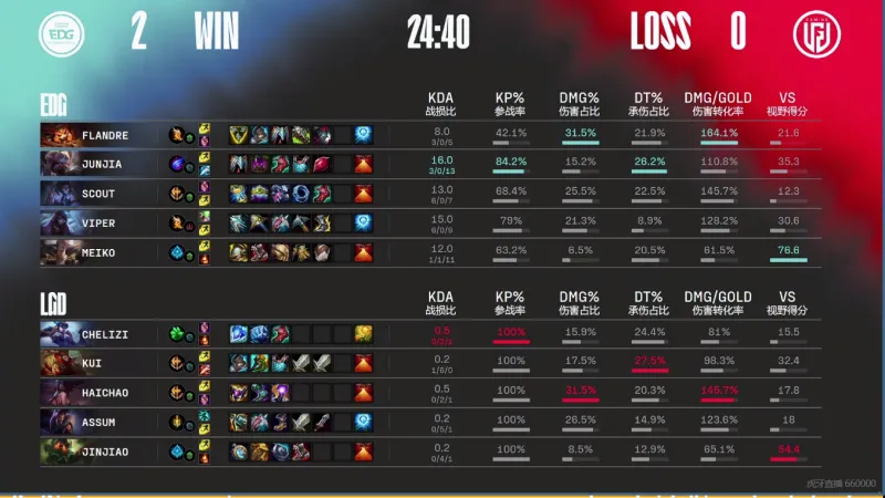 24分钟,德莱文先行阵亡,LGD正面团战溃败,EDG一波终结比赛。