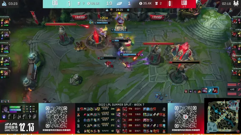 22分钟,LGD全员击杀瑟提,但EDG追击之下完成一波1换5团战。
