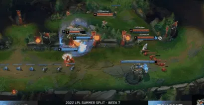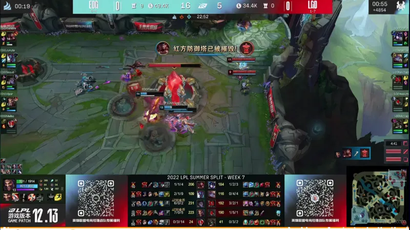 6分钟,LGD下路四包三,EDG果断反打配合支援赶到的塞拉斯,EDG完成一波0换3团战。
