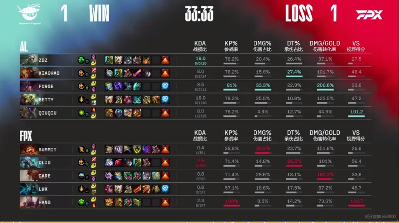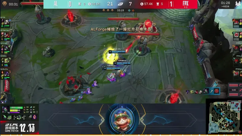 22分钟,岩雀封路FPX拿下大龙,但后续AL留人完成一波0换3团战,顺势拿下小龙。