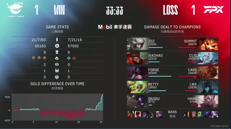 32分钟,猴子率先开团,AL完成一波0换5完美团战,一波终结比赛。