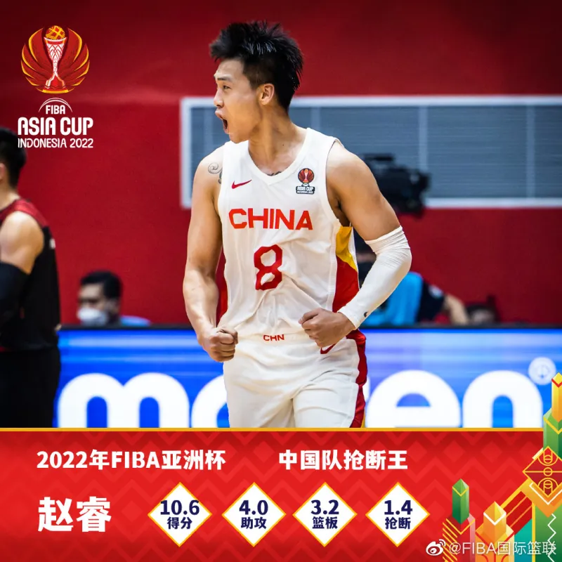 本届男篮亚洲杯,孙铭徽出战5场,场均7次助攻,全队最高。赵睿出战5场,场均1.4次抢断,全队最高。除此之外,孙铭徽场均得到9.2分3.2篮板,正负值11.2。赵睿场均得到10.6分4助攻3.2篮板。