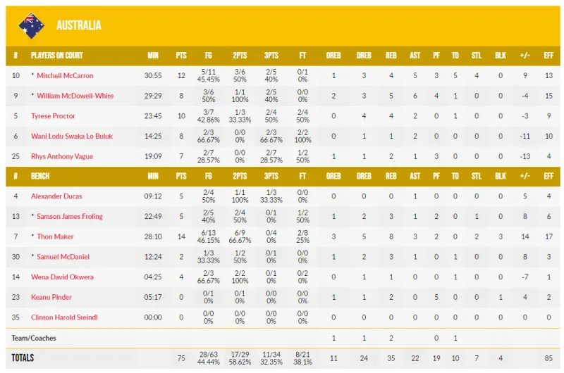 澳大利亚:梅克14分8篮板3助攻、麦卡伦12分4篮板5助攻4抢断、怀特8分5篮板6助攻、普罗科特10分4篮板。