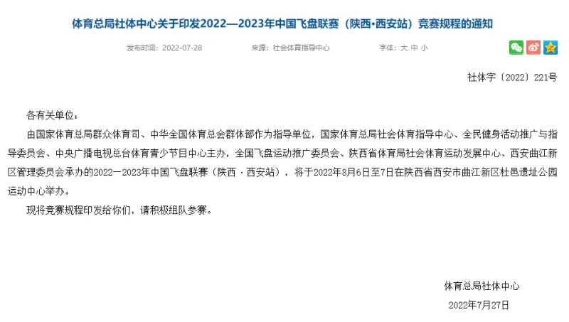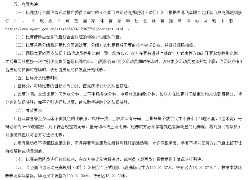 相关阅读:体育总局:拟于8月举办首届中国飞盘联赛,比赛场地为足球场