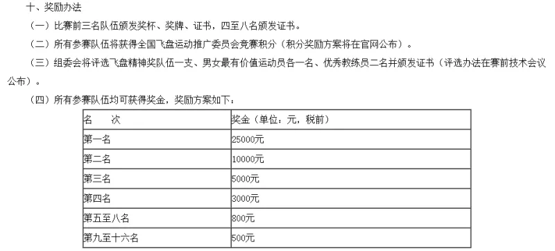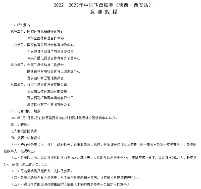 07月28日讯 国家体育总局社体中心印发通知,公布首届中国飞盘联赛(陕西·西安站)竞赛规程:比赛于8月6日开打,每队可报运动员14至28人,其中男、女运动员均不得少于7人,年龄应满14周岁。据悉,所有参赛队伍均可获得奖金,第一名将获得25000元奖金。