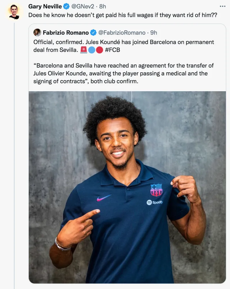 07月29日讯 在孔德正式加盟巴萨之后,曼联名宿内维尔在个人社交账号讽刺起了巴萨,他先是转发了罗马诺确认孔德转会的推文,然后写道:“孔德知不知道,等巴萨不想要他的时候,他是拿不到合同里的全部工资的。”