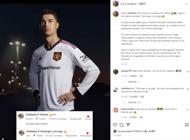 07月31日讯 C罗著名球迷账号,Factos梗的“始发地”,Instagram账号cr7.o_lendario在ins上联系发表数篇帖子,内容从截图C罗本人评论、C罗本人推文以及乔治娜推文再到P图,几乎应有尽有。