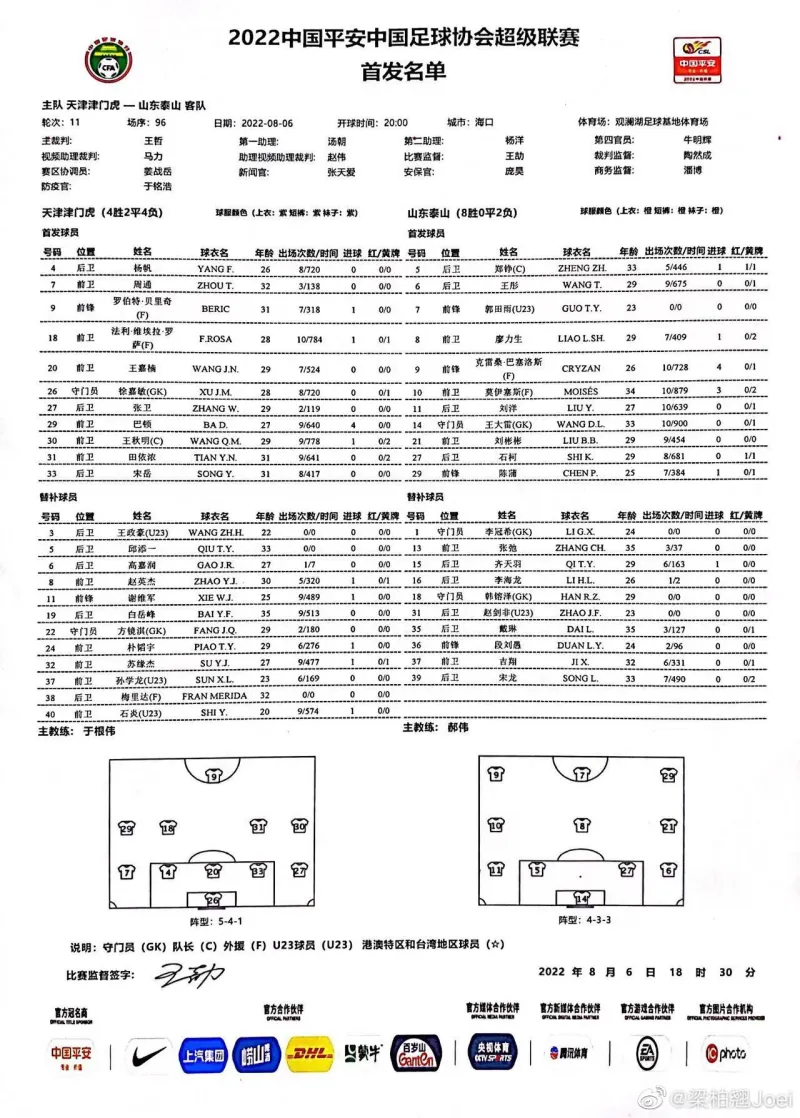 08月06日讯 中超联赛第11轮进入第二个比赛日,山东泰山和天津津门虎在海口赛区相遇。赛前,双方公布了首发阵容。