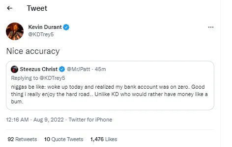 杜兰特转发了该网友的推特,并说:“说得好。”