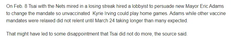 在今年2月8日,篮网陷入连败危机,蔡崇信聘请了一名说客去说服新任市长埃里克-亚当斯改变疫苗政策,以便未接种疫苗的欧文进入篮网主场打比赛。