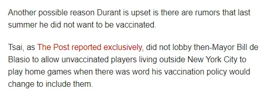 今日根据《纽约邮报》的报道,杜兰特对于老板蔡崇信的不满情绪远大于对纳什和马克斯的不满情绪,其中一部分原因是去年夏天他也不想接种疫苗,同时对于蔡崇信未能关于疫苗政令,向纽约市长做充分的游说工作而失望。