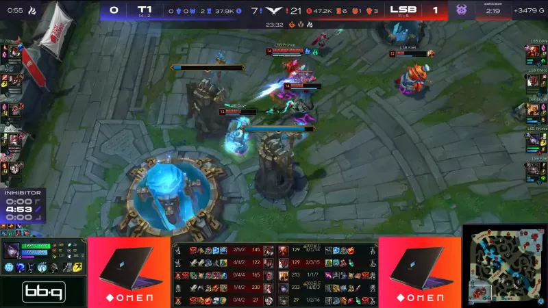 比赛第16分钟,T1抱团推塔。Oner猴子强开Kael塔姆,但LSB原地反打出一波0换5,Prince厄斐琉斯拿下双杀。
