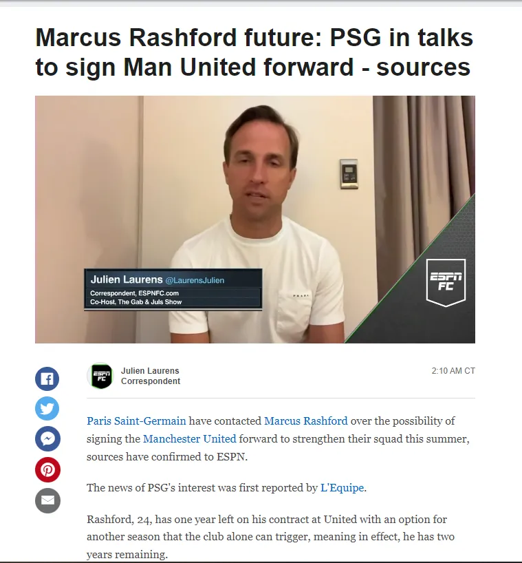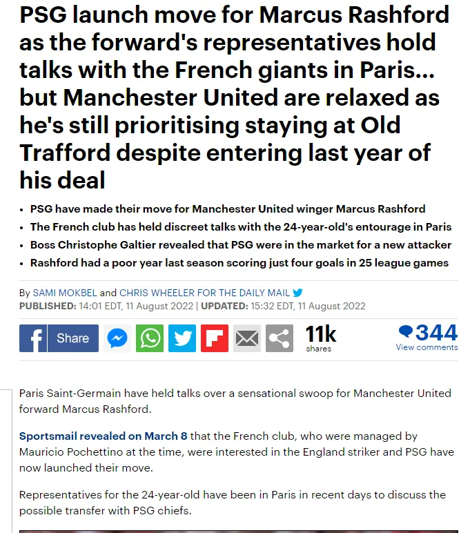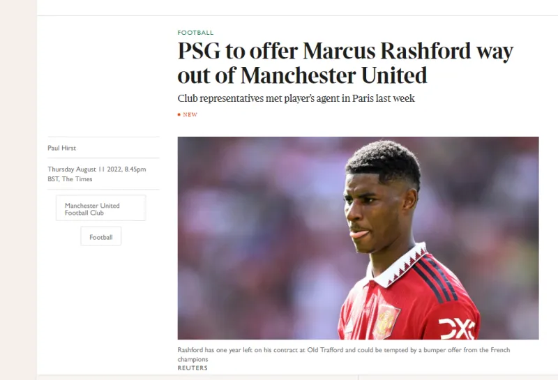 然而泰晤士报则报道称,巴黎方面担忧,拉什福德的团队可能是利用自己抬价,以期在曼联这里拿到更好的待遇。(They fear, however, that Rashford’s entourage are using PSG’s interest in the player to try to hurry United into giving him an improved deal at Old Trafford.)