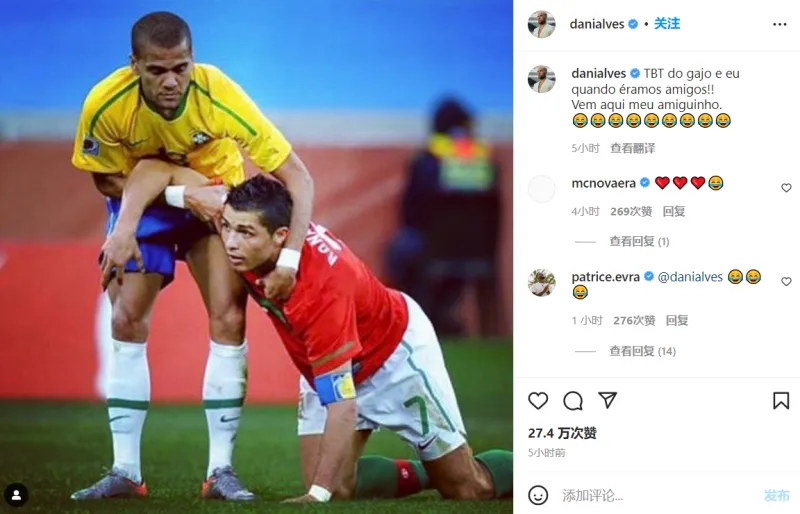 08月12日讯 巴西球星阿尔维斯在个人社交媒体晒出昔日代表巴西国家队与C罗同场竞技的照片,并配文写道:“周四怀旧日,当我和这个家伙还是朋友的时候。来我这里吧,我的小朋友。”