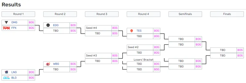 另一个半区OMG首轮迎战FPX,两队的胜者将挑战常规赛排名第五的EDG。