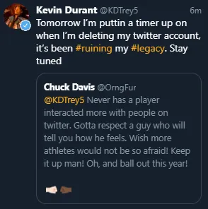 杜兰特回复:“明天我将设定一个计时器,它将会记录我距离卸载推特还有多久,推特一直在摧毁着我的历史地位。敬请关注”