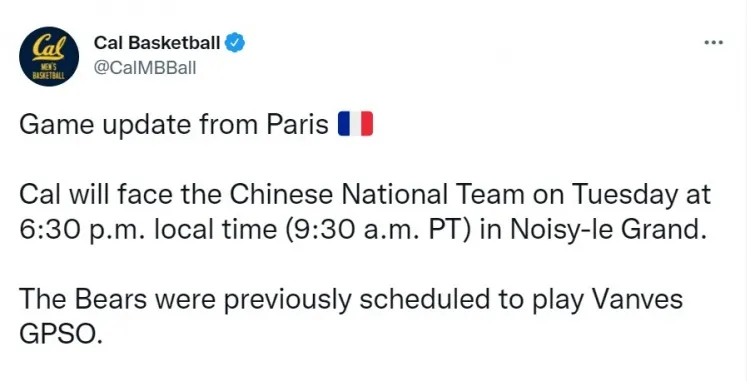 08月15日讯 根据加州大学伯克利分校男篮官方推特的消息,中国男篮将于当地时间周二下午6点半(北京时间周三凌晨1点半),与加州大学伯克利分校男篮在巴黎进行一场热身赛。
