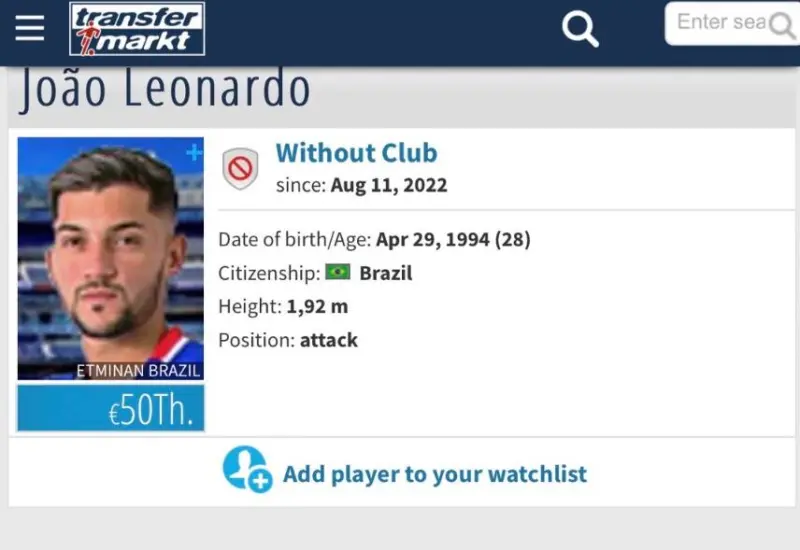 若昂-莱昂纳多长期在巴西国内踢球,曾短暂效力过葡萄牙、格鲁吉亚、洪都拉斯联赛。本赛季效力于巴西黑珍珠大学队,在巴西丁级联赛出场11次,打进1球,本月离开该队成为自由身。