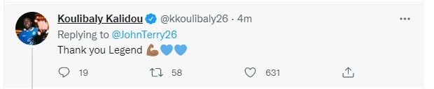 赛后库利巴利也是发布了自己进球后的庆祝照片,前切尔西名宿特里也是在评论区祝福了这位新加盟的后卫,后者随后回应到:谢谢你,传奇。