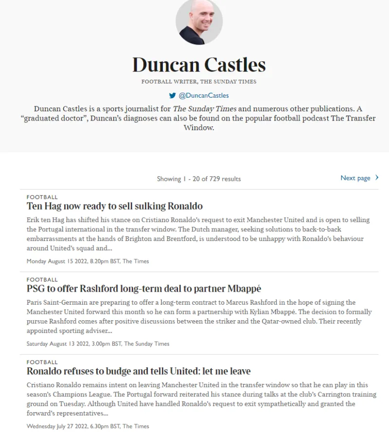 08月16日讯 国外球迷在为泰晤士报供稿的著名记者Duncan Castles(被誉为门德斯喉舌,最早独家了C罗告知曼联想离开)最新报道滕哈格愿意放走C罗,以及西蒙尼愿意用格列兹曼换C罗之后,整理了Duncan Castles今夏在泰晤士报刊发的几个独家报道。