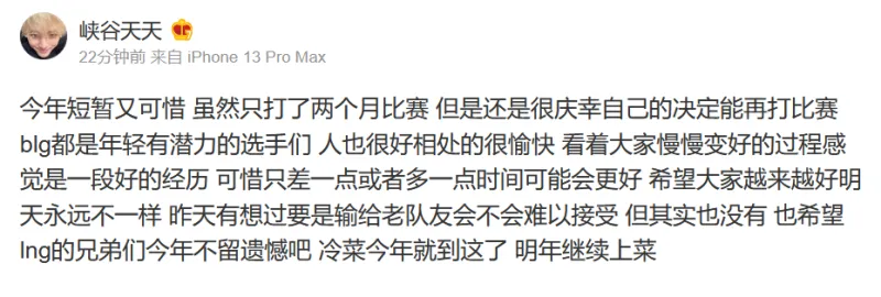 今年短暂又可惜 虽然只打了两个月比赛 但是还是很庆幸自己的决定能再打比赛 blg都是年轻有潜力的选手们 人也很好相处的很愉快