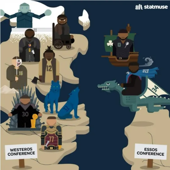 08月22日讯 今天,美国媒体StatMuse制作了一幅NBA版《权力的游戏》漫画。