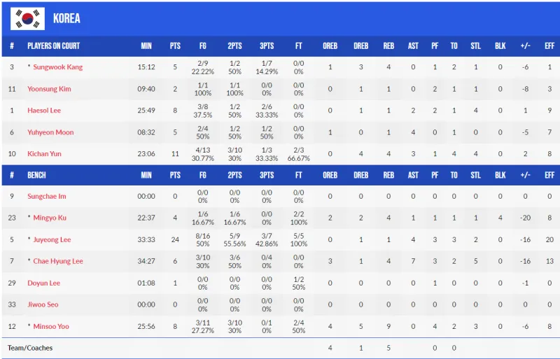 韩国队:李朱英24分1篮板4助攻2抢断,基灿云11分4篮板3助攻4抢断,民秀柳8分9篮板,李海松8分4抢断。