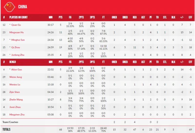 周琦19分11篮板3盖帽,孙铭徽13分6篮板,胡明轩11分5篮板,王哲林8分6篮板,郭艾伦5分,顾全5分。