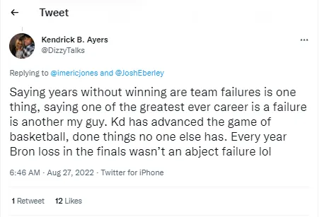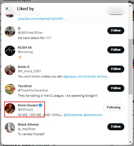 随后有12名网友对此推特点赞,其中一名ID为Kevin Durant,并在右上角有真人认证的网友名字为显眼。