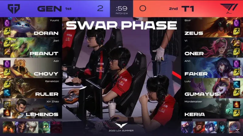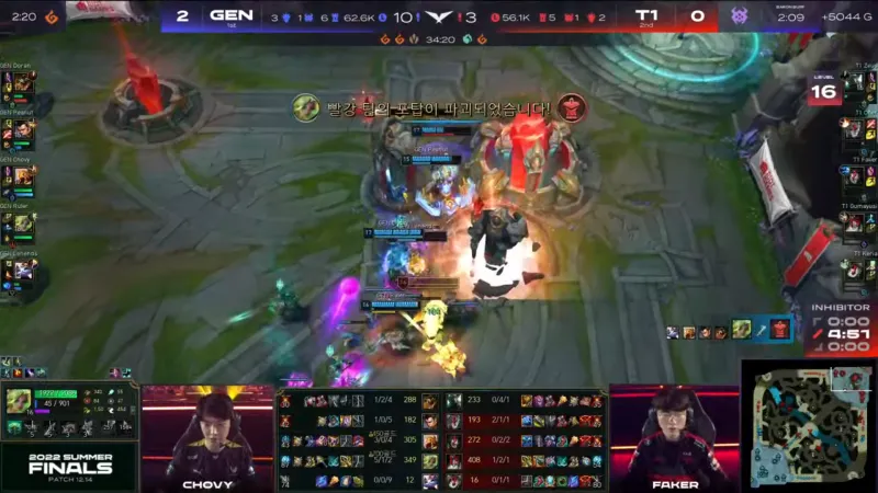 比赛第32分钟,Zeus试图TP绕后然而T1其余人撤退,Zeus被集火后GEN开大龙。随后GEN回身接团将T1团灭后一波结束比赛。