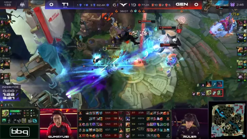 比赛第33分钟,GEN抓掉落单的Oner随后开大龙,T1被迫接团白打成0换4,Ruler再拿双杀,随后GEN拿下双龙汇。