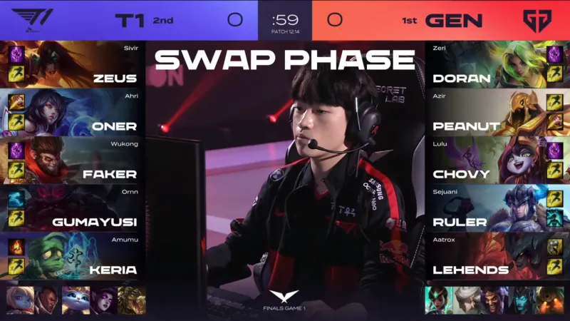 T1选用:Zeus奥恩、Oner猴子、Faker阿狸、Gumayusi希维尔、Keria阿木木