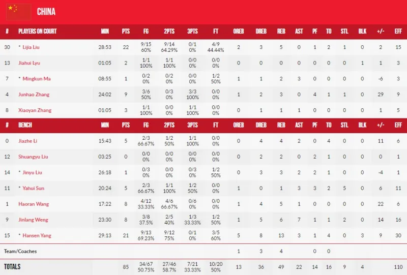 杨瀚森21分13篮板3助攻3盖帽,刘礼嘉22分5篮板,张峻豪9分3篮板,翁金郎8分6篮板7助攻,王浩然8分5篮板。