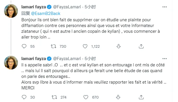 08月31日讯 巴黎圣日尔曼球星,法国国脚姆巴佩的母亲法伊扎-拉马里(Fayza Lamari)周三在Twitter上发表评论,姆巴佩家族“正在研究针对相关RMC的言论提出诽谤诉讼”。