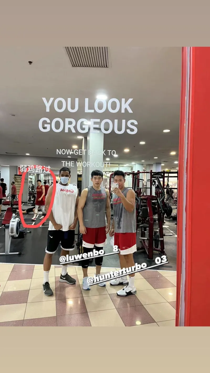 从图中可以看出,祝铭震、陆文博、贺希宁三人站在一起秀出肌肉,而胡明轩将站在身后的自己圈了起来,并打上“弱鸡路过”四个字。